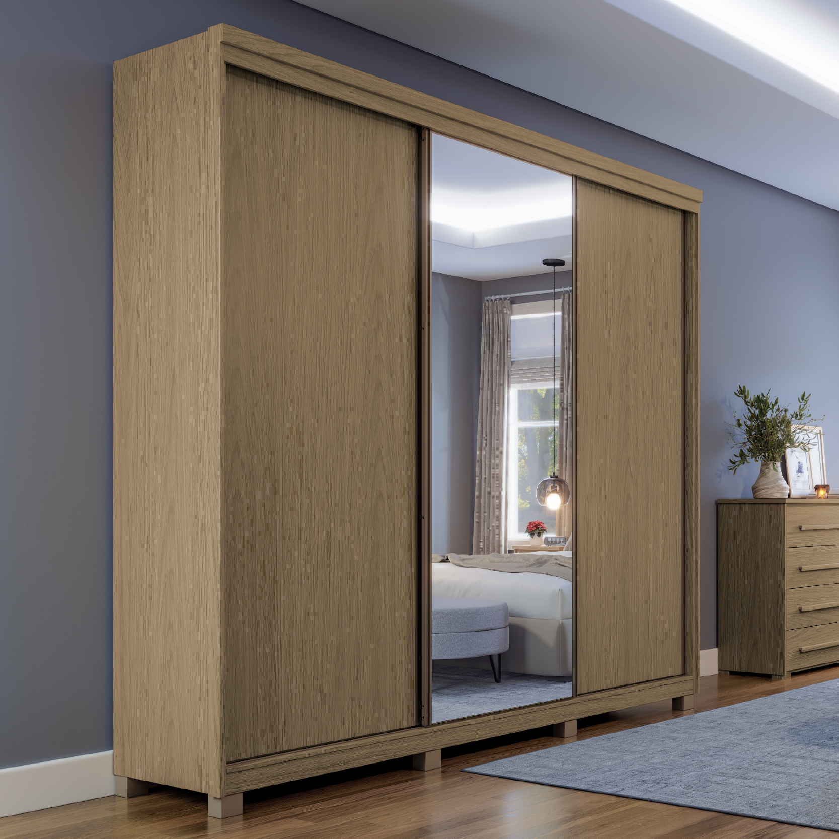 Robusto com a devida elegância, ele também tem a vantagem de se adaptar aos mais diversos projetos de decoração. A porta de correr central espelhada é, sem dúvidas, uma grande vantagem do produto, pois além de beleza, o espelho é um acessório demandando e aliado da rotina de qualquer pessoa.